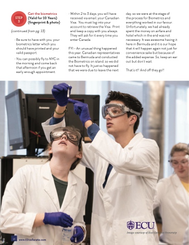 Get the biometrics STEP (Valid for 10 Years) • Within 2 to 3 days, you will have received via email, your Canadian Visa. You must log into your account to retrieve the Visa. Print and keep a copy with you always. They will ask for it every time you enter Canada. FYI - An unusual thing happened this year, Canadian representatives came to Bermuda and conducted the Biometrics on island, so we did not have to fly. It just so happened that we were due to leave the next day, so we were at the stage of the process for Biometrics and everything worked in our favour. Unfortunately, we had already spent the money on airfare and hotel which in the end was not necessary. It was awesome having it here in Bermuda and it is our hope that it will happen again not just for convenience sake but because of the added expense. So, keep an ear out but don’t wait. That’s it!! And off they go!! 3 (fingerprint & photo) (continued from pg. 13) • Be sure to have with you, your biometrics letter which you should have printed and your valid passport. • You can possibly fly to NYC in the morning and come back that afternoon if you get an early enough appointment. Image courtesy of East Carolina University 14 www.EDcellerate.com