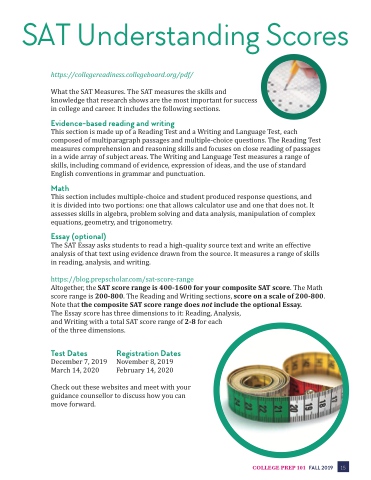 SAT Understanding Scores This section is made up of a Reading Test and a Writing and Language Test, each composed of multiparagraph passages and multiple-choice questions. The Reading Test measures comprehension and reasoning skills and focuses on close reading of passages in a wide array of subject areas. The Writing and Language Test measures a range of skills, including command of evidence, expression of ideas, and the use of standard English conventions in grammar and punctuation. https://collegereadiness.collegeboard.org/pdf/ What the SAT Measures. The SAT measures the skills and knowledge that research shows are the most important for success in college and career. It includes the following sections. Evidence-based reading and writing This section includes multiple-choice and student produced response questions, and it is divided into two portions: one that allows calculator use and one that does not. It assesses skills in algebra, problem solving and data analysis, manipulation of complex equations, geometry, and trigonometry. The SAT Essay asks students to read a high-quality source text and write an effective analysis of that text using evidence drawn from the source. It measures a range of skills in reading, analysis, and writing. Math Essay (optional) https://blog.prepscholar.com/sat-score-range Altogether, the SAT score range is 400-1600 for your composite SAT score. The Math score range is 200-800. The Reading and Writing sections, score on a scale of 200-800. Note that the composite SAT score range does not include the optional Essay. The Essay score has three dimensions to it: Reading, Analysis, and Writing with a total SAT score range of 2-8 for each of the three dimensions. December 7, 2019 November 8, 2019 March 14, 2020 February 14, 2020 Test Dates Registration Dates Check out these websites and meet with your guidance counsellor to discuss how you can move forward. COLLEGE PREP 101 FALL 2019 15