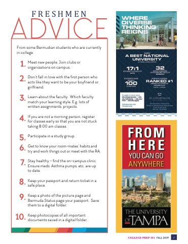 FRESHMEN ADVICE Where Diverse thinking Reigns NAMED A BEST NATIONAL UNIVERSITY U.S NEWS & WORLD REPORT 17:1 STUDENT-TO-FACULTY RATIO 32 SCHEV-AWARDED OUTSTANDING FACULTY MEMBERS STUDENTS FROM NEARLY NORFOLK VIRGINIA 100 RANKED #1 COUNTRIES To apply or learn more: odu.edu/programs | odu. edu/intladmin | odu.edu/ visit | odu.edu/apply intladm@odu.edu 757.683.3701 AMERICA’S FAVORITE LEISURE CITY TRAVEL + LEISURE Old Dominion University Office of International Admissions 2102 Dragas Hall Norfolk, VA 23529 From some Bermudian students who are currently in college 1. Meet new people. Join clubs or organizations on campus. 2. Don’t fall in love with the first person who acts like they want to be your boyfriend or girlfriend. 3. Learn about the faculty. Which faculty match your learning style. E.g. lots of written assignments, projects. 4. If you are not a morning person, register for classes early so that you are not stuck taking 8:00 am classes. 5. Participate in a study group. 6. Get to know your room-mates’ habits and try and work things out or meet with the RA. 7. Stay healthy – find the on-campus clinic. Ensure meds. Asthma pumps, etc. are up to date. 8. Keep your passport and return ticket in a safe place. 9. Keep a photo of the picture page and Bermuda Status page your passport. Save them to a digital folder. 10. Keep photocopies of all important documents saved in a digital folder. FROM HERE YOU CAN GO ANYWHERE COLLEGE PREP 101 FALL 2019 17