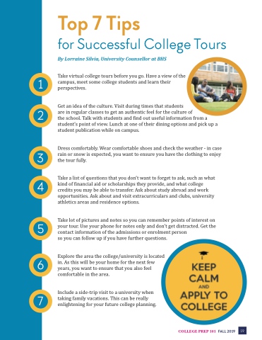 1 2 3 4 5 6 7 Top 7 Tips for Successful College Tours By Lorraine Silvia, University Counsellor at BHS Take virtual college tours before you go. Have a view of the campus, meet some college students and learn their perspectives. Get an idea of the culture. Visit during times that students are in regular classes to get an authentic feel for the culture of the school. Talk with students and find out useful information from a student’s point of view. Lunch at one of their dining options and pick up a student publication while on campus. Dress comfortably. Wear comfortable shoes and check the weather - in case rain or snow is expected, you want to ensure you have the clothing to enjoy the tour fully. Take a list of questions that you don’t want to forget to ask, such as what kind of financial aid or scholarships they provide, and what college credits you may be able to transfer. Ask about study abroad and work opportunities. Ask about and visit extracurriculars and clubs, university athletics areas and residence options. Take lot of pictures and notes so you can remember points of interest on your tour. Use your phone for notes only and don’t get distracted. Get the contact information of the admissions or enrolment person so you can follow up if you have further questions. Explore the area the college/university is located in. As this will be your home for the next few years, you want to ensure that you also feel comfortable in the area. Include a side-trip visit to a university when taking family vacations. This can be really enlightening for your future college planning. COLLEGE PREP 101 FALL 2019 19