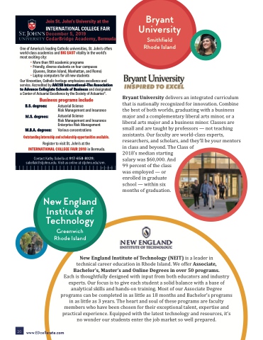 Bryant Join St. John’s University at the INTERNATIONAL COLLEGE FAIR December 5, 2019 CedarBridge Academy, Bermuda One of America’s leading Catholic universities, St. John’s offers world-class academics and BIG EAST vitality in the world’s most exciting city: • More than 100 academic programs • Friendly, diverse students on four campuses (Queens, Staten Island, Manhattan, and Rome) • Laptop computers for all new students Our Vincentian, Catholic heritage emphasizes excellence and service. Accredited by AACSB International–The Association to Advance Collegiate Schools of Business and designated a Center of Actuarial Excellence by the Society of Actuaries®. Business programs include B.S. degrees: M.S. degrees: M.B.A. degrees: Actuarial Science Risk Management and Insurance Actuarial Science Risk Management and Insurance Enterprise Risk Management Various concentrations Outstanding internship and scholarship opportunities available. Register to visit St. John’s at the INTERNATIONAL COLLEGE FAIR 2018 in Bermuda. Contact Kathy Sabella at 917-658-8029; sabellak@stjohns.edu. Visit us online at stjohns.edu/srm. M1-11414VC University Smithfield Rhode Island Bryant University delivers an integrated curriculum that is nationally recognized for innovation. Combine the best of both worlds, graduating with a business major and a complementary liberal arts minor, or a liberal arts major and a business minor. Classes are small and are taught by professors — not teaching assistants. Our faculty are world-class experts, researchers, and scholars, and they’ll be your mentors in class and beyond. The Class of New England 2018’s median starting salary was $60,000. And 99 percent of the class was employed — or enrolled in graduate school — within six months of graduation. Institute of Technology Greenwich Rhode Island New England Institute of Technology (NEIT) is a leader in technical career education in Rhode Island. We offer Associate, Bachelor’s, Master’s and Online Degrees in over 50 programs. Each is thoughtfully designed with input from both educators and industry experts. Our focus is to give each student a solid balance with a base of analytical skills and hands-on training. Most of our Associate Degree programs can be completed in as little as 18 months and Bachelor’s programs in as little as 3 years. The heart and soul of these programs are faculty members who have been chosen for their exceptional talent, expertise and practical experience. Equipped with the latest technology and resources, it’s 20 www.EDcellerate.com no wonder our students enter the job market so well prepared.