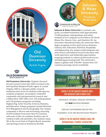 Johnson & Wales University Old Dominion University Norfolk, Virginia Old Dominion University: Virginia’s forward- focused research university. ODU is located in the metropolitan Hampton Roads region of coastal Virginia. ODU is a dynamic public research institution that serves its students with rigorous academic programs, an energetic residential community, and entrepreneurial research and collaboration. ODU offers over 120 undergraduate and 130 graduate programs; including Engineering, Cyber Security, Sciences, Business, and Education. Unique programs include Maritime Port Management and Oceanography. Our campus community is diverse and welcoming, attracting 24,500 students from more than 90 countries with state-of-the-art academic facilities and 14 residence halls and amenities. Our students enjoy life at the ocean front in Virginia Beach, museums and sporting events in downtown Norfolk. Providence Rhode Island Johnson & Wales University is a private, non- profit, accredited institution with approximately 15,000 graduate, undergraduate and online students at its 4 campuses in Providence, RI; North Miami, Fla.; Denver, Colo.; and Charlotte, NC. An innovative educational leader, the university offers degree programs in Arts and Sciences, Business, Culinary Arts, Education, Nutrition, Hospitality and Engineering. Our unique model integrates arts and sciences and industry-focused education with work experience and leadership opportunities, inspiring students to achieve professional success and lifelong personal growth. The university’s impact is global, with 100,000+ alumni from 155 countries pursuing careers worldwide. STUDY IN CANADA RATED #1 IN THE GREATER TORONTO AREA FOR GRADUATE EMPLOYMENT RATE CERTIFICATES, DIPLOMAS, GRADUATE CERTIFICATES AND NEW BACHELOR PROGRAMS OVER HALF OUR PROGRAMS INCLUDE FIELD PLACEMENTS, CO-OP AND INDUSTRY-BASED PROJECTS RATED #1 IN THE GREATER TORONTO AREA FOR INTERNATIONAL STUDENT SATISFACTION FIND OUT MORE WWW.DURHAMCOLLEGE.CA/INTERNATIONAL COLLEGE PREP 101 FALL 2019 21