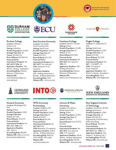 Durham College Location: Oshawa, Ontario, CA Setting: Suburban Student Population: 12,000 Average Class Size: 36 Tuition: $15,000 CA East Carolina University Location: Greenville, North Carolina USA Setting: Small Town Student Population: 23,010 Average Class Size: 28 Tuition: $23,516 Fanshawe College Location: Ontario, Canada Setting: Urban Student Population: 14,000 Average Class Size: 25 Tuition: $17,00 Flagler College Location: St. Augustine, FL USA Setting: Small town Student Population: 2,500 Average Class Size: 16 Tuition: $19,400 Room & Board: $12,160 Financial Aid for International Students: Yes SAT–1126ACT–24 GPA: 3.5 required Essay required Application Deadline: Fall - March 1/ Spring - December 1 Accrediting Body: SACS Website URL: www.flagler.edu Application Deadline: Fall – Rolling admissions Accrediting Body: Ontario Ministry of Education Website URL: https://www.fanshawec.ca/ Room & Board: $10,000 CA Financial Aid for International Students: Yes SAT /ACT/ GPA: NA Application Deadline: Fall – March / Spring - September Accrediting Body: Ontario Ministry of Education Website URL: www.durhamcollege.ca/ international Room & Board: $11,135 Financial Aid for International Students: Yes SAT /ACT: test optional GPA: minimum of 2.5 required Room & Board: $10.000 Financial Aid for International Students: Yes SAT /ACT: test optional GPA: 2.5 Fall – Rolling admissions / Spring – Rolling admissions Accrediting Body: SACS WebsiteURL: www.ecu.edu Application Deadline: COLLEGE PREP 101 FALL 2019 23 Howard University Location: Washington DC USA Setting: Urban INTO University Partnerships Johnson & Wales University New England Institute of Technology Student Population: 5,830 Average Class Size: Tuition: $27,206 Room&Board: $14,374 Financial Aid for International Students: Yes SAT 1080 GPA 3.33 Application Deadline: Location: Brighton, UK Setting: Suburban Student Population: 8,000 Average Class Size: 22 Tuition: $18,000 Location: Providence, Rhode Island USA Setting: Urban Student Population: 12,859 Average Class Size: 22 Tuition: $33,054 Location: Greenwich, RI USA Setting: Small town Student Population: 2,500 Average Class Size: 16 Tuition: $30,000 IT/ Engineering $16,000 Auto/ HVAC/Plumbing Room&Board: $13,000 Financial Aid for International Students: Yes SAT /ACT: NA GPA: 2.5 ApplicationDeadline: Fall: August 1 & Spring: Feb. 1 Accrediting Body: NECHE Website URL: www.neit.edu Room & Board: $9,700 Financial Aid for International Students: Yes SAT /ACT: NA Room & Board: from $7,872 - $13,863 Financial Aid for International Students: Yes SAT /ACT: test optional GPA: 2.75 required Application Deadline: Fall & Spring – Rolling Admissions Accrediting Body: NECHE WebsiteURL: www.jwu.edu Fall – Feb.15 Accrediting Body: MSCHE Website URL: https://www2. howard.edu/admission GPA: Minimum 2.5 required Application Deadline: Fall & Spring – Rolling admission Accrediting Body: NWCCU, SACS, NEASC, HLC, QAA Website URL: www.intostudy.com