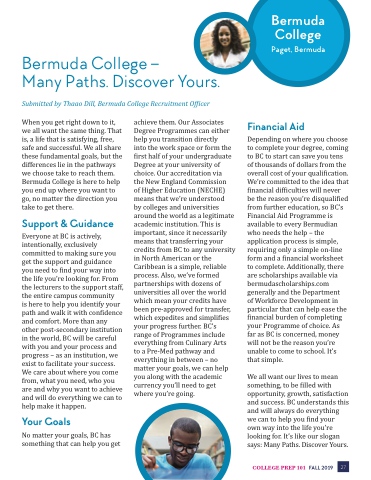 Bermuda College – Many Paths. Discover Yours. Submitted by Thaao Dill, Bermuda College Recruitment Officer Bermuda College Paget, Bermuda When you get right down to it, we all want the same thing. That is, a life that is satisfying, free, safe and successful. We all share these fundamental goals, but the differences lie in the pathways we choose take to reach them. Bermuda College is here to help you end up where you want to go, no matter the direction you take to get there. achieve them. Our Associates Degree Programmes can either help you transition directly into the work space or form the first half of your undergraduate Degree at your university of choice. Our accreditation via the New England Commission of Higher Education (NECHE) means that we’re understood by colleges and universities around the world as a legitimate academic institution. This is important, since it necessarily means that transferring your credits from BC to any university in North American or the Caribbean is a simple, reliable process. Also, we’ve formed partnerships with dozens of universities all over the world which mean your credits have been pre-approved for transfer, which expedites and simplifies your progress further. BC’s range of Programmes include everything from Culinary Arts Financial Aid Support & Guidance Depending on where you choose to complete your degree, coming to BC to start can save you tens of thousands of dollars from the overall cost of your qualification. We’re committed to the idea that financial difficulties will never be the reason you’re disqualified from further education, so BC’s Financial Aid Programme is available to every Bermudian who needs the help – the application process is simple, requiring only a simple on-line form and a financial worksheet to complete. Additionally, there are scholarships available via bermudascholarships.com generally and the Department Everyone at BC is actively, intentionally, exclusively committed to making sure you get the support and guidance you need to find your way into the life you’re looking for. From the lecturers to the support staff, the entire campus community of Workforce Development in particular that can help ease the financial burden of completing your Programme of choice. As far as BC is concerned, money will not be the reason you’re unable to come to school. It’s that simple. is here to help you identify your path and walk it with confidence and comfort. More than any other post-secondary institution in the world, BC will be careful with you and your process and progress – as an institution, we exist to facilitate your success. We care about where you come from, what you need, who you are and why you want to achieve and will do everything we can to help make it happen. to a Pre-Med pathway and everything in between – no matter your goals, we can help you along with the academic currency you’ll need to get where you’re going. We all want our lives to mean something, to be filled with opportunity, growth, satisfaction and success. BC understands this and will always do everything we can to help you find your own way into the life you’re looking for. It’s like our slogan says: Many Paths. Discover Yours. Your Goals No matter your goals, BC has something that can help you get COLLEGE PREP 101 FALL 2019 27