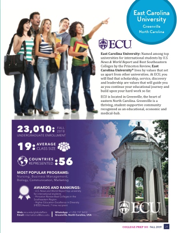 East Carolina East Carolina University: Named among top universities for international students by U.S. News & World Report and Best Southeastern Colleges by the Princeton Review, East ® Carolina University lives by values that set us apart from other universities. At ECU, you will find that scholarship, service, discovery and leadership are values that will guide you as you continue your educational journey and build upon your hard work so far. ECU is located in Greenville, the heart of eastern North Carolina. Greenville is a thriving, student-supportive community recognized as an educational, economic and medical-hub. University Greenville North Carolina 23,010: FALL 2018 UNDERGRADUATE ENROLLMENT 19:AVERAGE CLASS SIZE COUNTRIES :56 REPRESENTED MOST POPULAR PROGRAMS: Nursing, Business Management, Biology, Communication, Marketing AWARDS AND RANKINGS: - U.S. News and World Report top university for international students - Princeton Review Best Colleges in the Southeastern Region - Higher Education Excellence in Diversity (HEED) Award, 7 time recipient Web: ecu.edu/globalaffairs | WhatsApp: +1 252 737 5412 Email: international@ecu.edu Greenville, North Carolina, USA COLLEGE PREP 101 FALL 2019 29