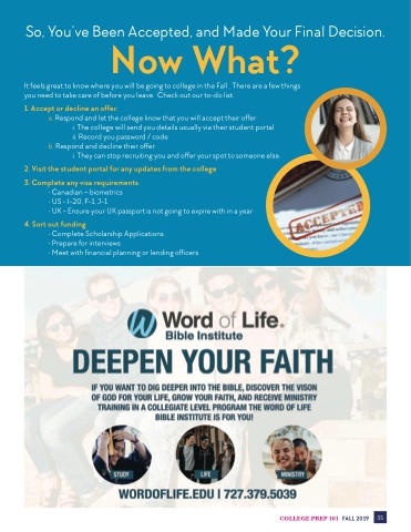 So, You’ve Been Accepted, and Made Your Final Decision. Now What? It feels great to know where you will be going to college in the Fall. There are a few things you need to take care of before you leave. Check out our to-do list. 1. Accept or decline an offer. a. Respond and let the college know that you will accept their offer i. The college will send you details usually via their student portal ii. Record you password / code b. Respond and decline their offer i. They can stop recruiting you and offer your spot to someone else. 2. Visit the student portal for any updates from the college 3. Complete any visa requirements • Canadian – biometrics • US - I-20, F-1, J-1 • UK - Ensure your UK passport is not going to expire with in a year 4. Sort out funding • Complete Scholarship Applications • Prepare for interviews • Meet with financial planning or lending officers COLLEGE PREP 101 FALL 2019 35