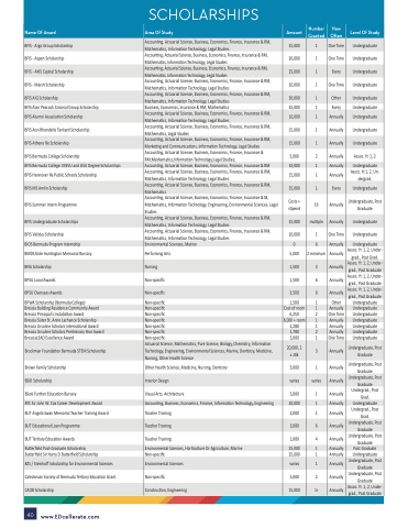 Name Of Award BFIS - Argo Group Scholarship BFIS - Aspen Scholarship BFIS - AXIS Capital Scholarship BFIS - Marsh Scholarship BFIS AIG Scholarship BFIS Alan Peacock Colonial Group Scholarship BFIS Alumni Association Scholarship BFIS Aon Rhondelle Tankard Scholarship BFIS Athene Re Scholarship BFIS Bermuda College Scholarship BFIS Bermuda College: MSVU and GSU Degree Scholarships BFIS Hannover Re Public Schools Scholarship BFIS MS Amlin Scholarship BFIS Summer Intern Programme BFIS Undergraduate Scholarships BFIS Validus Scholarship BIOS Bermuda Program Internship BMDS Kate Huntington Memorial Bursary BNA Scholarship BPSU Local Awards BPSU Overseas Awards BPWA Scholarship (Bermuda College) Brescia Building Residence Community Award Brescia Principal's Installation Award Brescia Sister St. Anne Lachance Scholarship Brescia Ursuline Scholars International Award Brescia Ursuline Scholars Preliminary Year Award BresciaLEAD Excellence Award Brockman Foundation Bermuda STEM Scholarship Brown Family Scholarship BSID Scholarship BSoA Further Education Bursary BTC Sir John W. Cox Career Development Award BUT Angela Swan Memorial Teacher Training Award BUT Educational Loan Programme BUT Tertiary Education Awards Butterfield Post-Graduate Scholarship Butterfield Sir Harry D Butterfield Scholarship BZS / Steinhoff Scholarship for Environmental Sciences Caledonian Society of Bermuda Tertiary Education Grant CAOB Scholarship SCHOLARSHIPS Area Of Study Accounting, Actuarial Science, Business, Economics, Finance, Insurance & RM, Mathematics, Information Technology, Legal Studies Accounting, Actuarial Science, Business, Economics, Finance, Insurance & RM, Mathematics, Information Technology, Legal Studies Accounting, Actuarial Science, Business, Economics, Finance, Insurance & RM, Mathematics, Information Technology, Legal Studies Number How Granted Often Amount 25,000 20,000 25,000 10,000 30,000 25,000 10,000 15,000 15,000 5,000 10,000 15,000 25,000 Costs + 25,000 10,000 0 5,000 1,500 1,500 3,500 1,500 Cost of room 6,250 6,000 + room 2,280 1,780 5,000 20,000, 2 x 10k 5,000 varies 5,000 20,000 2,000 3,000 1,000 Environmental Sciences, Horticulture Or Agriculture, Marine Non-specific 25,000 1 1 1 1 1 1 1 1 1 2 1 1 1 16 multiple 1 6 2 minimum 3 6 6 1 1 2 1 1 2 1 3 1 varies 1 1 1 6 4 1 1 1 2 1+ One Time One Time Every One Time Other Every Annually Annually Annually Annually Annually Annually Every Annually Annually One Time Annually Annually Annually Annually Annually Other Annually One Time Annually Annually Annually One Time Annually Annually Annually Annually Annually Annually Annually Annually Annually Annually Annually Annually Annually Level Of Study Undergraduate Undergraduate Undergraduate Undergraduate Undergraduate Undergraduate Undergraduate Undergraduate Undergraduate Assoc. Yr. 1, 2 Undergraduate Assoc. Yr.1, 2, Un- dergrad. Undergraduate Undergraduate, Post Graduate Undergraduate Undergraduate Undergraduate Assoc. Yr. 1, 2, Under- grad., Post Grad. Assoc. Yr. 1, 2, Under- grad., Post Graduate Assoc. Yr. 1, 2, Under- grad., Post Graduate Assoc. Yr. 1, 2, Under- grad., Post Graduate Undergraduate Undergraduate Undergraduate Undergraduate Undergraduate Undergraduate Undergraduate Undergraduate, Post Graduate Undergraduate, Post Graduate Undergraduate, Post Graduate Undergrad., Post Grad. Undergraduate Undergrad., Post Grad. Undergraduate, Post Graduate Undergraduate, Post Graduate Post Graduate Undergraduate Undergraduate, Post Graduate Undergraduate, Post Graduate Assoc. Yr. 1, 2, Under- grad., Post Graduate Accounting, Actuarial Science, Business, Economics, Finance, Insurance Mathematics, Information Technology, Legal Studies Accounting, Actuarial Science, Business, Economics, Finance, Insurance Mathematics, Information Technology, Legal Studies & RM, & RM, Business, Economics, Insurance & RM, Mathematics Accounting, Actuarial Science, Business, Economics, Finance, Insurance Mathematics, Information Technology, Legal Studies Accounting, Actuarial Science, Business, Economics, Finance, Insurance Mathematics, Legal Studies Accounting, Actuarial Science, Business, Economics, Finance, Insurance Marketing and Communications, Information Technology, Legal Studies Accounting, Actuarial Science, Business, Economics, Finance, Insurance RM;Mathematics;Information Technology;Legal Studies; Accounting, Actuarial Science, Business, Economics, Finance, Insurance Accounting, Actuarial Science, Business, Economics, Finance, Insurance Mathematics, Information Technology, Legal Studies Accounting, Actuarial Science, Business, Economics, Finance, Insurance Mathematics Accounting, Actuarial Science, Business, Economics, Finance, Insurance Mathematics, Information Technology, Engineering, Environmental Sciences, Legal Studies stipend Accounting, Actuarial Science, Business, Economics, Finance, Insurance & RM, Mathematics, Information Technology, Legal Studies Accounting, Actuarial Science, Business, Economics, Finance, Insurance & RM, Mathematics, Information Technology, Legal Studies Environmental Sciences, Marine Performing Arts Nursing Non-specific Non-specific Non-specific Non-specific Non-specific Non-specific Non-specific Non-specific Non-specific Actuarial Science, Mathematics, Pure Science, Biology, Chemistry, Information Technology, Engineering, Environmental Sciences, Marine, Dentistry, Medicine, Nursing, Other Health Science Other Health Science, Medicine, Nursing, Dentistry Interior Design Visual Arts, Architecture Accounting, Business, Economics, Finance, Information Technology, Engineering Teacher Training Teacher Training Teacher Training Environmental Sciences Non-specific Construction, Engineering varies 5,000 15,000 & RM, & RM, & RM, & & RM & RM, & RM, & M, 25,000 40 www.EDcellerate.com