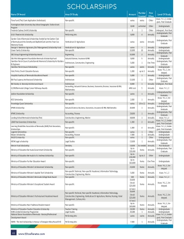 Name Of Award SCHOLARSHIPS Area Of Study Non-specific Non-specific Performing Arts Horticulture Or Agriculture Horticulture Or Agriculture Non-specific Engineering Actuarial Science, Insurance & RM Architecture, Construction, Engineering Non-specific Non-specific Non-specific Architecture Architecture Accounting, Actuarial Science, Business, Economics,Finance, Insurance & RM, Mathematics Amount varies 3,040 0 5,000 varies varies 10,000 10,000 5,000 5,000 varies 1,000 5,000 15,000 8,000 AINS cost Number How Granted Often Level Of Study Assoc. Yr. 1, 2, Under- grad., Post Graduate Undergraduate Undergrad., Post Grad. Undergraduate, Post Graduate Undergraduate, Post Graduate Undergraduate Undergraduate Undergraduate, Post Graduate Undergraduate Undergraduate, Post Graduate Undergraduate Assoc. Yr.1, 2, Un- dergrad. Undergraduate Undergraduate, Post Graduate Undergrad., Post Grad. Assoc. Yr. 1, 2 Undergraduate;Post Graduate; Assoc. Yr.1, 2, Un- dergrad. Undergraduate Undergraduate, Post Graduate Undergraduate, Post Graduate Assoc. Yr. 1, 2 Assoc. Yr. 1, 2, Under- grad., Post Graduate Assoc. Yr. 1, 2, Under- grad., Post Graduate Undergraduate Undergraduate Undergraduate Undergraduate, Post Graduate Post Graduate Undergraduate, Post Graduate Undergraduate Undergraduate Assoc. Yr.1, 2, Un- dergrad. Assoc. Yr. 1, 2 Assoc. Yr. 1, 2 Assoc. Yr.1, 2, Un- dergrad. Assoc. Yr.1, 2, Un- dergrad. Assoc. Yr.1, 2, Un- dergrad. Undergraduate Undergraduate Assoc. Yr. 1, 2, Under- grad., Post Graduate Undergraduate, Post Graduate Flora Fund (The) Grant Application (Individuals) Framingham State University Day School Geographic Tuition Grant Program Frederick Sydney Smith Scholarship G & S Theatre Arts Scholarship Garden Club of Bermuda Scholarships funded by the Garden Club of Bermuda and the Dorothy and Bayfield Clark and the Freer Cox Memorial Funds George E. Wardman Agronomy (Turf Management) Scholarship Fund Green Family Scholarship GSC Group Engineering Scholarship Award GSU Risk Management Foundation Bermuda Scholarship Fund Hamilton Parish Council Leslie Barrett Memorial Scholarship for Builders & Engineers Hamilton Parish Council Scholarship Holy Trinity Church Education Bursary Hospitals Auxiliary of Bermuda Educational Award IBA Paul Lepercq Architectural Scholarship IBA Stanley G. Kennedy Architectural Award ILS/BII/Bermuda College Career Pathways Awards Jardine Foundation Scholarship KEO Scholarship Knowledge Quest Scholarship KPMG Scholarship KPMG Scholarship Landing School Bermuda Scholarship (The) LDAB Post-Secondary Scholarships Learning Disabilities Association of Bermuda (LDAB) Post-Secondary Scholarships Legends Scholarships Mazars Scholarship McGill Scholarship MDM Legal scholarship Mercer Fund Scholarship Ministry of Education Bermuda Government Scholarship Ministry of Education Bermuda to St. Andrews Scholarship Ministry of Education Further Education Award Ministry of Education Minister's Achievement Scholarship Ministry of Education Minister's Applied Tech Scholarship Ministry of Education Minister's Bermuda College Book Award Ministry of Education Minister's Exceptional Student Award Ministry of Education Minister's Technical and Vocational Award Ministry of Education Non-Traditional Student Award Ministry of Education Teacher Education Scholarship MJM Limited Scholarship Programme National Dance Foundation of Bermuda - Bursary/Professional Development Award NDFB - The Arch Scholarship in Honour of Georgine Mary Russell Hill Non-specific varies Non-specific 2,000 varies unlimited 1 4 varies 1 10 2 5 1 varies up to 3 1 1 1 5 1 1 10 to 12 1 1 1 2 4 1 1 1 1 As needed Varies Up to 2 Varies Varies Varies Varies Varies Varies Varies Varies 1 varies 1 Other Other Other Annually Annually Annually Annually Annually Annually One Time Annually Annually Annually Other Annually Annually Annually Annually Annually Annually Annually Annually Annually Annually Other Annually Other Annually Annually Annually Other One Time Annually Annually Annually Annually Annually Annually Annually Annually Annually Annually Non-specific Actuarial Science, Business, Economics, Insurance & RM, Mathematics Accounting, Finance Construction, Engineering, Marine Non-specific Non-specific Non-specific Accounting, Finance Non-specific Legal Studies Dentistry Non-specific Non-specific Non-specific Non-specific Non-specific Technical, Non-specific Vocational, Information Technology, Construction, Engineering, Marine Non-specific Non-specific Non-specific Technical, Non-specific Vocational, Information Technology, Construction, Engineering, Horticulture Or Agriculture, Marine, Nursing, Hotel Management, Culinary Arts Non-specific Teacher Training Legal Studies Performing Arts Performing Arts varies 20,000 20,000 40,000 1,500 1,500 varies 7,500 varies 15,000 10,000 Up to $35,000 Up to £35,000 Up to $10,000 25,000 5,000 500 $5,000 (local) $25,000 (o'seas) $5,000 (local) $25,000 (o'seas) Up to $20,000 20,000 25,000 varies 7,500 42 www.EDcellerate.com