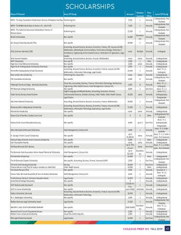 Name Of Award NDFB - The Argo Foundation Scholarship in Honour of Madame Ana Roje NDFB - The BF&M Scholarship In Honour of L. John Profit NDFB - The Catherine Zeta-Jones Scholarship in Honour of Patricia Calnan Nicholl Scholarships OIL Group Scholarship Awards (The) Orbis Summer Internship 2020 Orbis Summer Analysts OWIT Scholarship Paget Lions Club Memorial Scholarship Paget Parish Undergraduate Scholarship (Overseas) PartnerRe Undergraduate Scholarship Award Peter Leitner Arts Scholarship PHC Foundation Scholarship Pittsburgh Technical College - Bermuda Scholarship PPC Bermuda College Scholarship Public Service Bursary Award Scheme PwC Peter Mitchell Scholarship RenaissanceRe Undergraduate Scholarship Richard Eve Scholarship Rotary Club of Hamilton Student Loan Fund Sandys Parish Council Educational bursary SKAL International Bermuda Scholarship St. George's Parish Council Scholarship Stanley & May Ashworth Jones University Scholarship Starr Foundation Awards Tall Ships Bermuda 2017 Bursary The Bermuda Hotel Association Adrian Hassell Memorial Scholarship The Hamilton Scholarship The IIA Bermuda Chapter Scholarship The Vicki Smith Nursing Scholarship Thomas Mercer Fund (The) for study in dentistry or allied field Tom Davies Bursary (The) Tomasz Tabor Bermuda Hospitality & Tourism Studies Scholarship Trott & Duncan Shirley D. Simmons Education Award United World College Scholarship UOIT Global Leadership Award UOIT In Course Scholarships Validus Scholarship, Bermuda W. C. Waddington Scholarship Walkers Bermuda Legal Scholarship Award WALTER S. SAUL YOUTH EXCHANGE BURSARY Warwick Parish Council Educational Bursary William Purvis University Scholarship WQ Legal Scholarship Awards SCHOLARSHIPS Area Of Study Performing Arts Performing Arts Performing Arts Non-specific Non-specific Accounting, Actuarial Science, Business, Economics, Finance, HR, Insurance & RM, Mathematics, Marketing & Communications, Pure Science, Biology, Chemistry, IT, Architecture, Engineering, Environmental Science, Horticulture Or Agriculture, Legal Studies Accounting, Actuarial Science, Business, Finance, Mathematics Non-specific Non-specific Non-specific Accounting, Actuarial Science, Business, Economics, Finance, Insurance & RM, Mathematics, Information Technology, Legal Studies Performing Arts, Visual Arts Non-specific Visual Arts, Accounting, Business, Finance, Information Technology, Architecture, Engineering, Other Health Science, Hotel Management, Culinary Arts Non-specific English Language and Related Studies, Accounting, Economics, Finance, Environmental Sciences, Dentistry, Nursing, Public Health, Other Health Science, Legal Studies Accounting, Actuarial Science, Business, Economics, Finance, Mathematics Accounting, Actuarial Science, Business, Economics, Finance, Insurance & RM, Amount 7,500 7,500 15,000 25,000 20,000 varies varies 1,000 1,000 5,000 25,000 varies 4,000 5,000 6,000 10,000 20,000 Number How Granted Often Level Of Study Undergraduate, Post Graduate Undergraduate, Post Graduate Undergraduate, Post Graduate Undergraduate, Post Graduate Undergraduate, Post Graduate Undergrad. Undergraduate Undergraduate Undergraduate Undergraduate Assoc. Yr.1, 2, Undergrad. Undergraduate Undergraduate, Post Graduate Assoc. Yr.1, 2, Undergrad. Assoc. Yr. 1, 2 Assoc. Yr. 2, Undergraduate, Postgraduate Undergraduate, Post Graduate Undergraduate Undergraduate Undergraduate;Post Graduate; Assoc. Yr. 2, Undergraduate, Postgraduate Assoc. Yr. 2, Under- graduate Assoc. Yr. 1, 2, Under- grad., Post Graduate Undergraduate Undergraduate Assoc. Yr. 1, 2, Under- grad., Post Graduate Undergraduate Undergraduate Undergraduate, Post Graduate Undergraduate Undergraduate Associate Yr. 1 Assoc. Yr.1, 2, Undergrad. Undergraduate Undergraduate Undergraduate Undergraduate Undergraduate Undergraduate Undergraduate, Post Graduate Assoc. Yr.1, 2, Undergrad. Undergraduate Undergraduate Undergraduate, Post Graduate 1 1 1 Discretion- ary 2 Multiple varies 1 varies 1 1 varies 8 15 1 varies 1 1 varies 0 0 Annually Annually Annually Annually Annually Annually Annually Other Annually Annually Annually Annually Annually Annually One Time Annually Annually Annually Annually Other One Time Annually Annually Other Annually One Time Annually Every One Time One Time Other Annually Annually Annually Annually Annually Annually Annually Annually Annually Annually Annually Annually One Time 25,000 Non-specific varies Mathematics, Information Technology, Engineering, Legal Studies Non-specific Non-specific Hotel Management, Culinary Arts Non-specific Non-specific Non-specific Non-specific, Marine Hotel Management, Culinary Arts Non-specific Non-specific, Accounting, Business, Finance, Insurance & RM Nursing Other Health Science Non-specific Hotel Management, Culinary Arts Legal Studies Non-specific 0 Non-specific Non-specific Accounting, Actuarial Science, Business, Economics, Finance, Insurance & RM, Mathematics, Information Technology Non-specific Legal Studies Non-specific Non-specific Visual Arts, Performing Arts Legal Studies CD$18k for 4 yrs. up to CD$2k 4,000 5,000 up to 3 1 up to $5,000.00 varies 2,000 varies Up to 75% of costs Up to $25,000 25,000 2,000 20,000 12,000 3,000 6,500 1 varies varies Discretion- ary 1 1 1 1 1 2 1 1 1 Unlimited 1 10,000 20,000 1,000 1 15,000 1 $500-$5000 Discretion- ary 5,000 1 2,000 10,000 1 2 COLLEGE PREP 101 FALL 2019 43