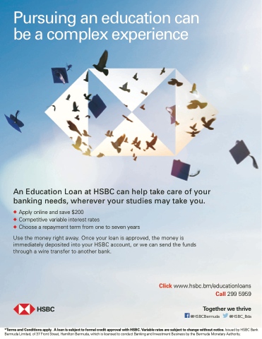 Pursuing an education can be a complex experience An Education Loan at HSBC can help take care of your banking needs, wherever your studies may take you. Apply online and save $200 Competitive variable interest rates Choose a repayment term from one to seven years Use the money right away. Once your loan is approved, the money is immediately deposited into your HSBC account, or we can send the funds through a wire transfer to another bank. Click www.hsbc.bm/educationloans Call 299 5959 Together we thrive Bermuda’s Ultimate Resource for College Preparation @HSBCBermuda @HSBC_Bda *Terms and Conditions apply. A loan is subject to formal credit approval with HSBC. Variable rates are subject to change without notice. Issued by HSBC Bank Bermuda Limited, of 37 Front Street, Hamilton Bermuda, which is licensed to conduct Banking and Investment Business by the Bermuda Monetary Authority.