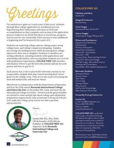 Greetings I’m excited once again as I coach some of this years’ students through their college application to enrollment process. Experiencing their enthusiasm and sense of relief and accomplishment as they complete each section of the application process reinforces my belief that there is much hope, progress and success for our community. Their journey to true adulthood is beginning and I’m honored to be a part of it. Students are exploring college options, taking exams, doing college tours, and college comparison shopping. Families are sorting out funding sources while discussing best college options for their son or daughter. Guidance counsellors are writing references, assisting students with applications and scholarship information and ensuring their students are on track with graduation requirements. COLLEGE PREP 101 provides information of how to get the best educational options for each person and how to pay for it. Each person has a role to play in this awesome journey as our young adults navigate their way toward meeting their career goals via the college route. They are on the road to becoming the men and women who will lead our future. EDcellerate in collaboration with the Department of Education will host the 25th annual Bermuda International College and University Fair on December 5th. Come and meet the 28 international college recruiters. Parents and the general public are invited to come and get tips about college and scholarship preparation requirements. Join us between 5:45 pm & 8:00 pm. Let’s make this college prep season one that is positive and productive. Cheers, Sandra Dill B.Sc., M.A., M.Ed. CEO & Founder of EDcellerate Publisher of COLLEGE PREP 101 Organizer of the Bermuda International College and University Fair 6 www.EDcellerate.com COLLEGE PREP 101 Publisher and Editor Sandra Dill Design & Production Norma Marks Cover Images Jermayme Dears, Sandra Dill Interior Images Graphicstock, Roger Williams, ECU Writers and Contributors Department of Workforce Development Ministry of Education Department of Statistics Sandra Dill – Edcellerate Education - USA Lorraine Silvia - Bermuda High School Thaao Dill - Bermuda College Jamillah Lodge - Bermuda Economic Development Corporation Jane Bielby - BermudaScholarships.com Bermuda’s Students Jermayme Dears Samaria Tatem Seon Tatem Connor Hay Vanessa Gilbert Macy Aicardi Taj Donville-Outerbridge Ryan Robinson-Perinchief Printed By Printing Finishers Inc. Contact Us E-mail: info@EDcellerate.com Phone: 441-535-2372 Visit our website: www.EDcellerate.com COLLEGE PREP 101 is published twice a year in the Fall and Spring. We reserve the right to edit or reject submissions without the consent of the writer or contributor. Opinions expressed by contributors or writers does not necessarily reflect the opinions of the publisher. We value your input. Send ideas, articles and comments to info@EDcellerate.com