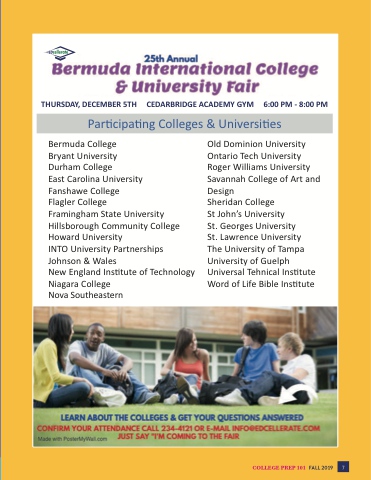 THURSDAY, DECEMBER 5TH CEDARBRIDGE ACADEMY GYM 6:00 PM - 8:00 PM Participating Colleges & Universities Bermuda College Bryant University Durham College East Carolina University Fanshawe College Flagler College Framingham State University Hillsborough Community College Howard University INTO University Partnerships Johnson & Wales New England Institute of Technology Niagara College Nova Southeastern Old Dominion University Ontario Tech University Roger Williams University Savannah College of Art and Design Sheridan College St John’s University St. Georges University St. Lawrence University The University of Tampa University of Guelph Universal Tehnical Institute Word of Life Bible Institute COLLEGE PREP 101 FALL 2019 7