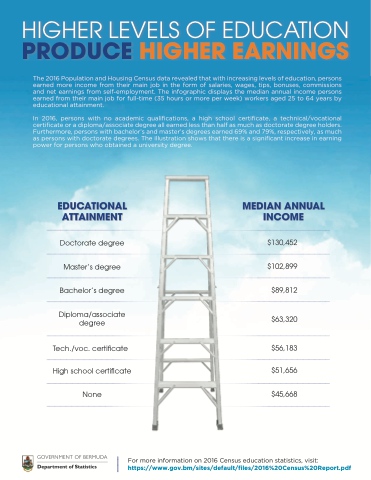 Doctorate degree Master’s degree Bachelor’s degree Diploma/associate degree Tech./voc. certificate High school certificate PRODUCE HIGHER EARNINGS - HIGHER LEVELS OF EDUCATION None For more information on 2016 Census education statistics, visit: https://www.gov.bm/sites/default/files/2016%20Census%20Report.pdf